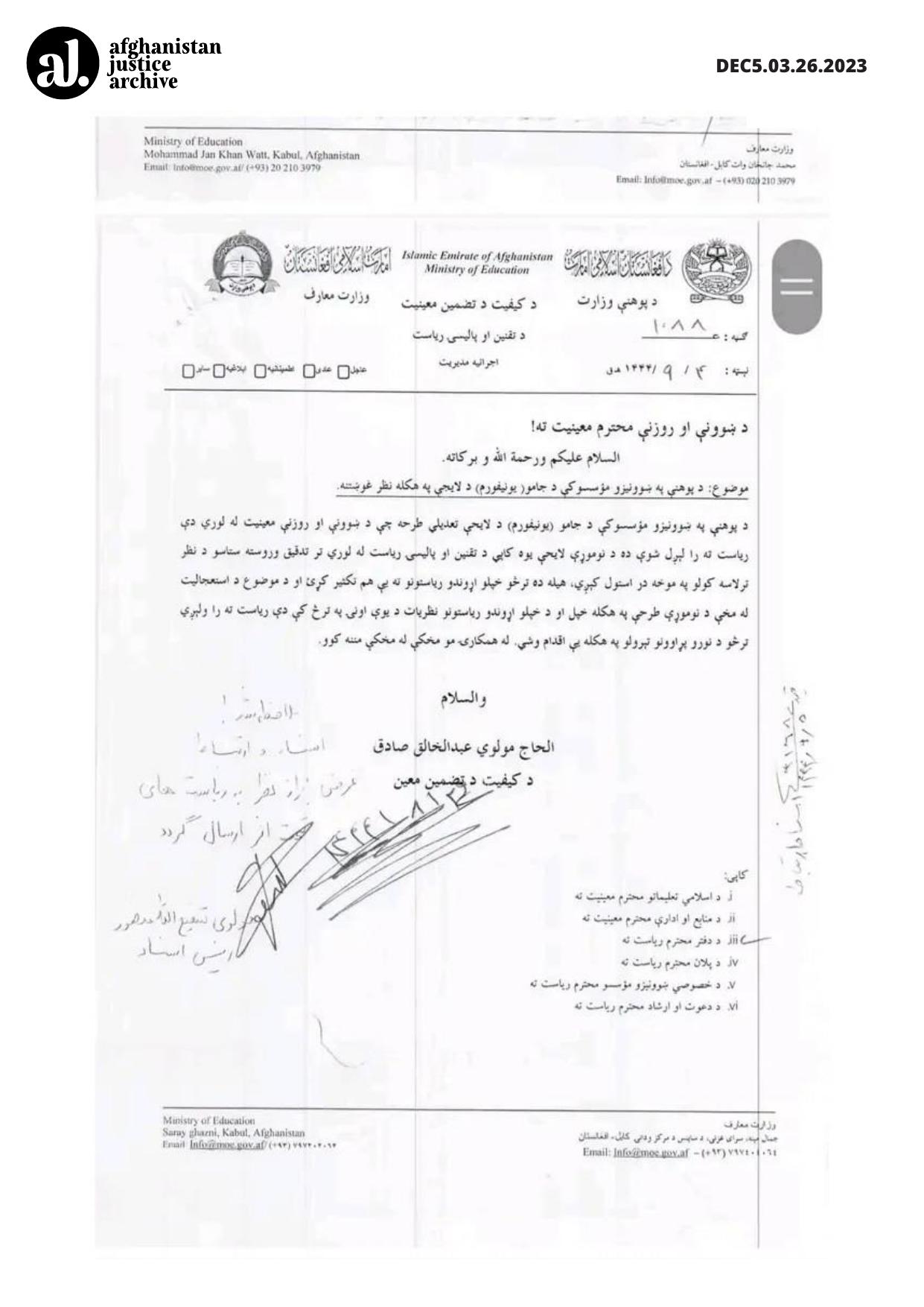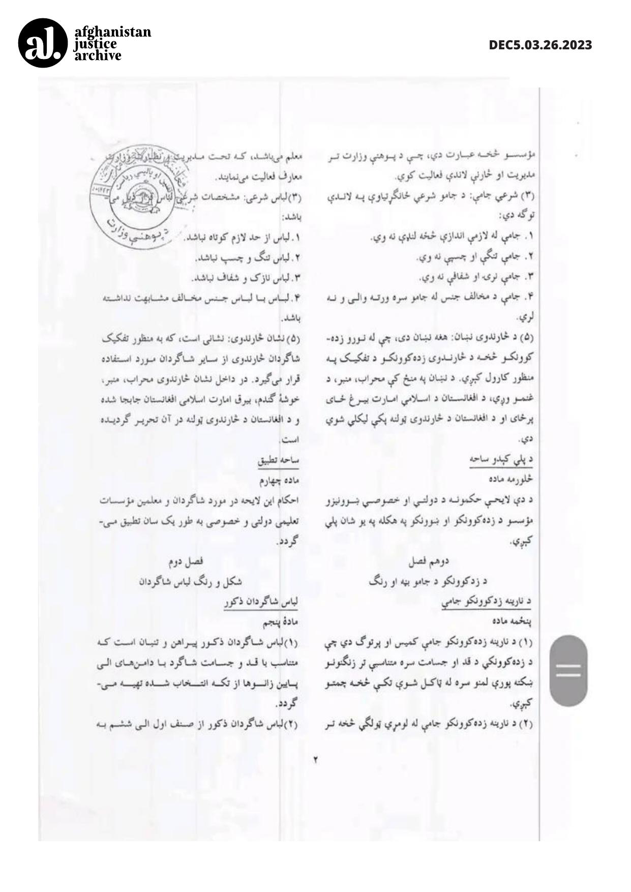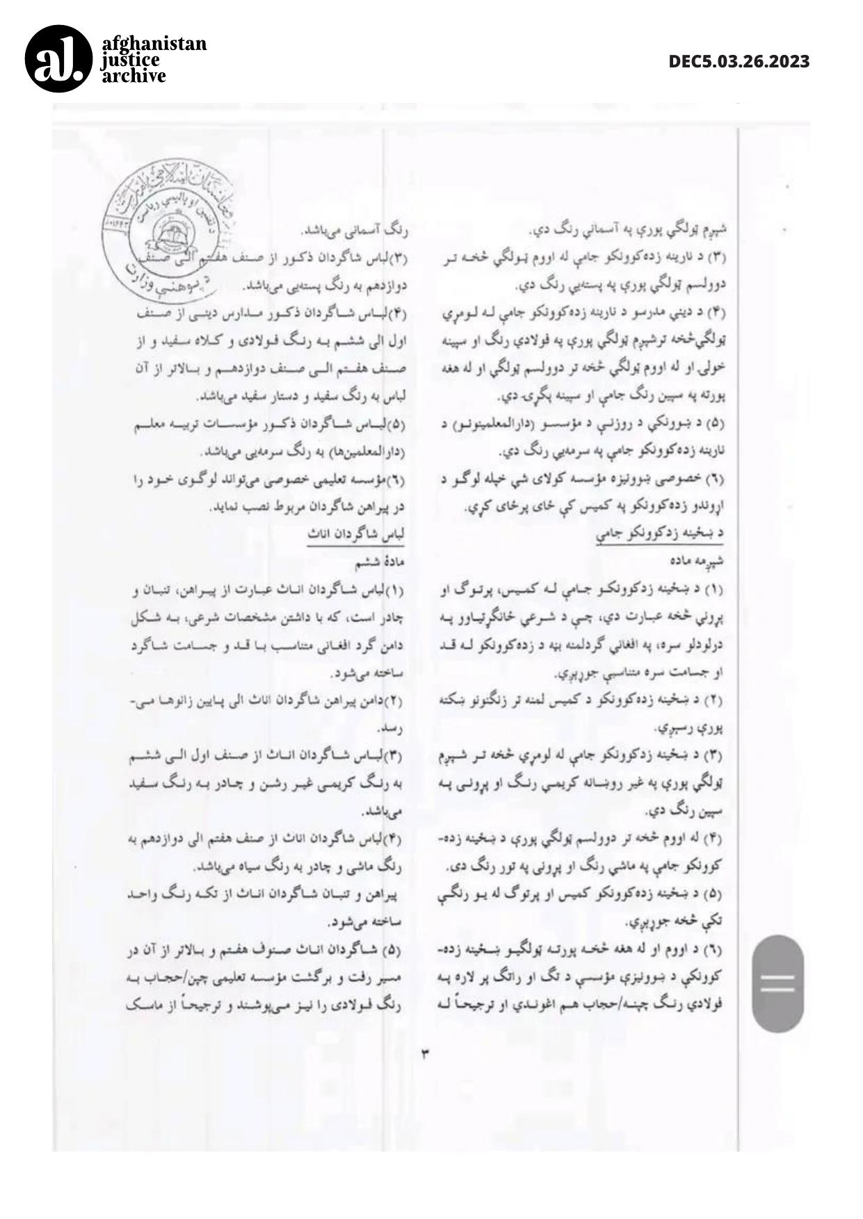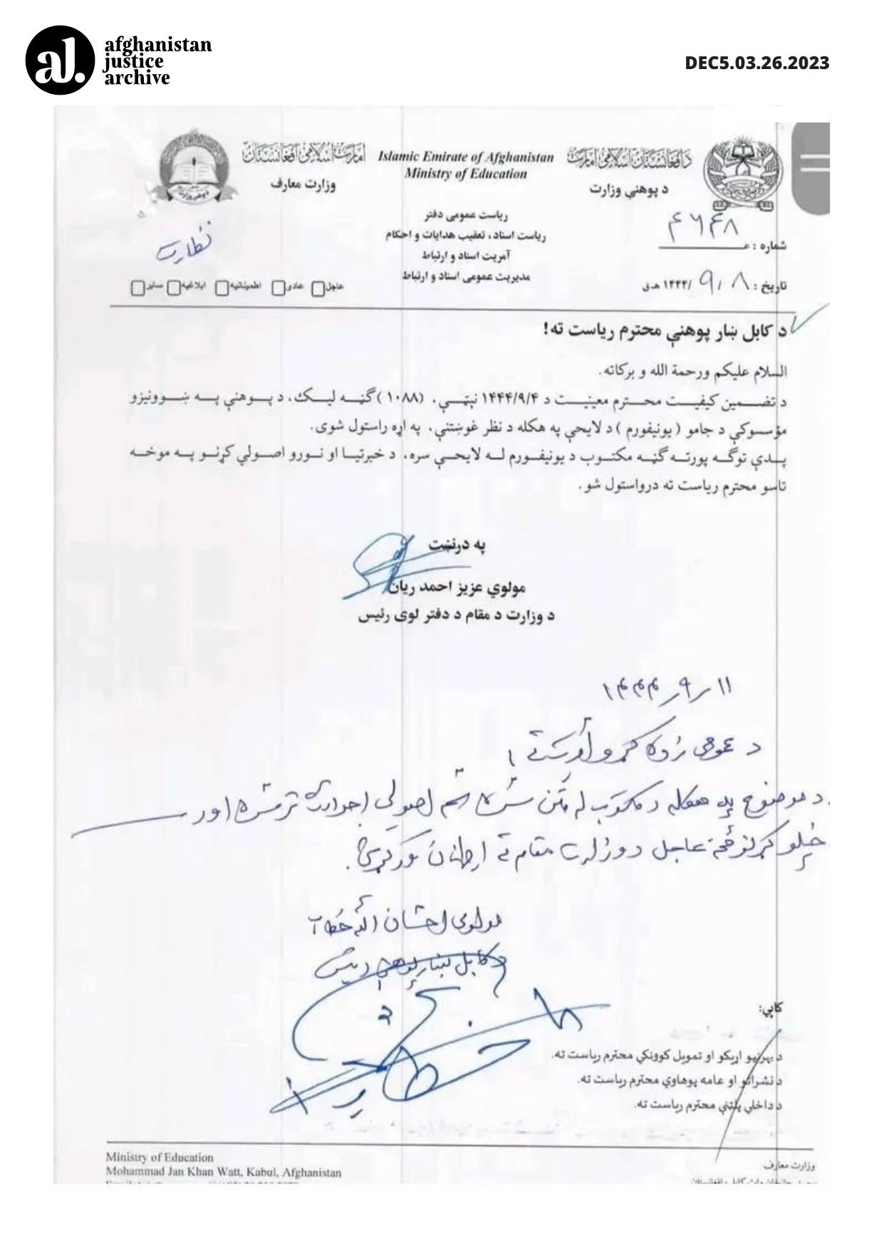 This document is best classified as a written directive because it is an official communication, issued in writing by the Ministry of Education, requesting action (review and response) on a pending draft policy. Although it does not contain finalized policy content or enforcement instructions, it signals the development of a uniform policy likely related to gender and dress regulations. It is not an official decree, order, or regulation yet, but part of the policy formation process. The internal nature of the document, its bureaucratic tone, and the call for cross-departmental input suggest a procedural step in shaping future educational mandates, which may later materialize as enforceable rules or regulations.
