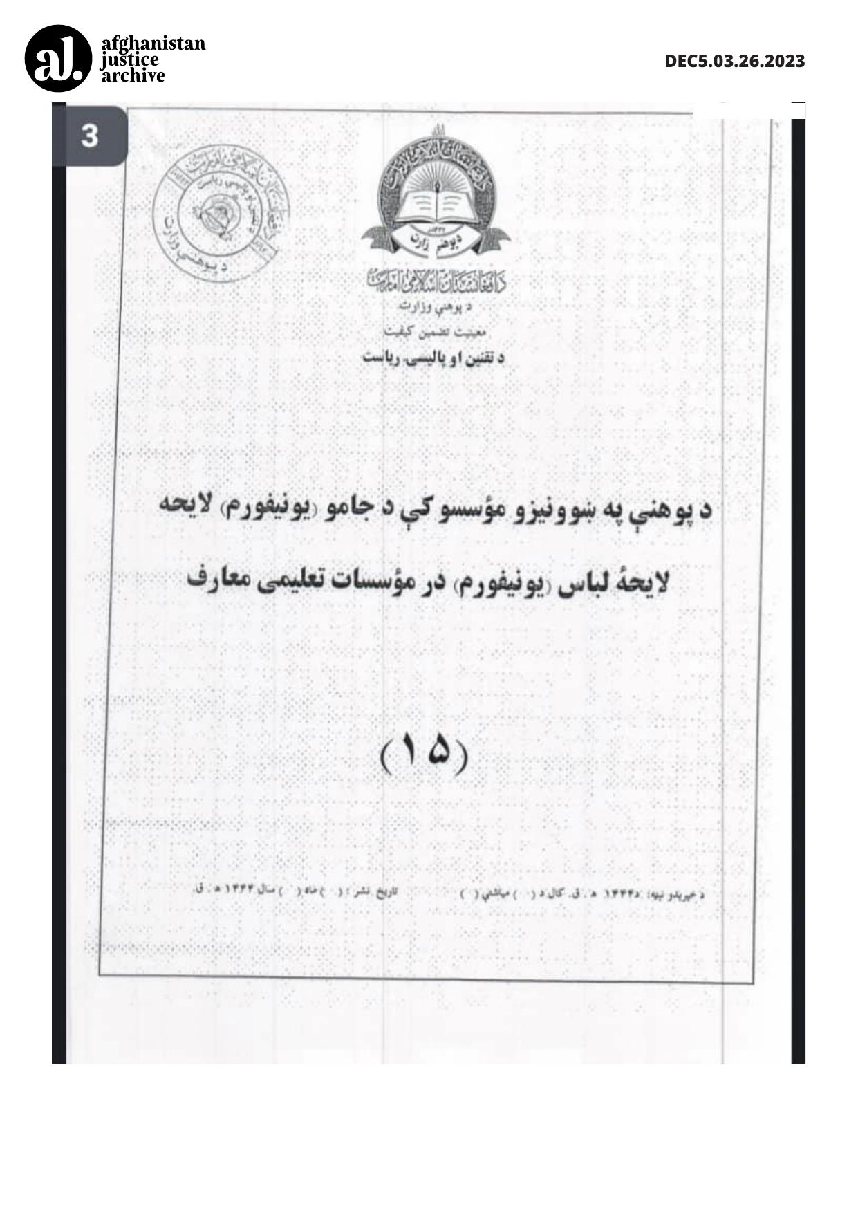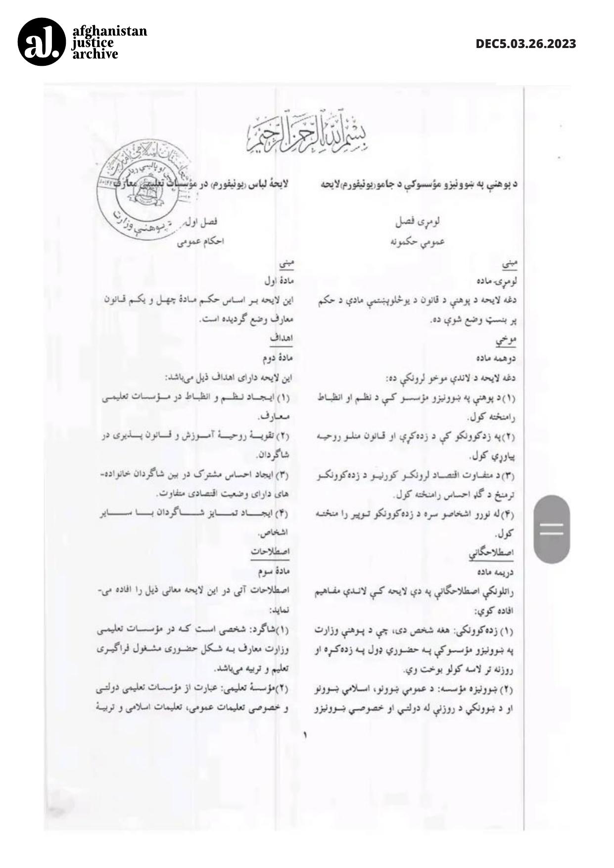 The draft amendment to the uniform policy in educational institutions, which has been submitted to this directorate by the Deputy Ministry of Education, is under review. A copy of this draft has been sent to you by the Legislation and Policy Directorate for your feedback. We kindly request that you also share it with your relevant departments. Due to the urgency of the matter, please send your and your departments’ opinions regarding this draft within one week so that further steps can be taken.