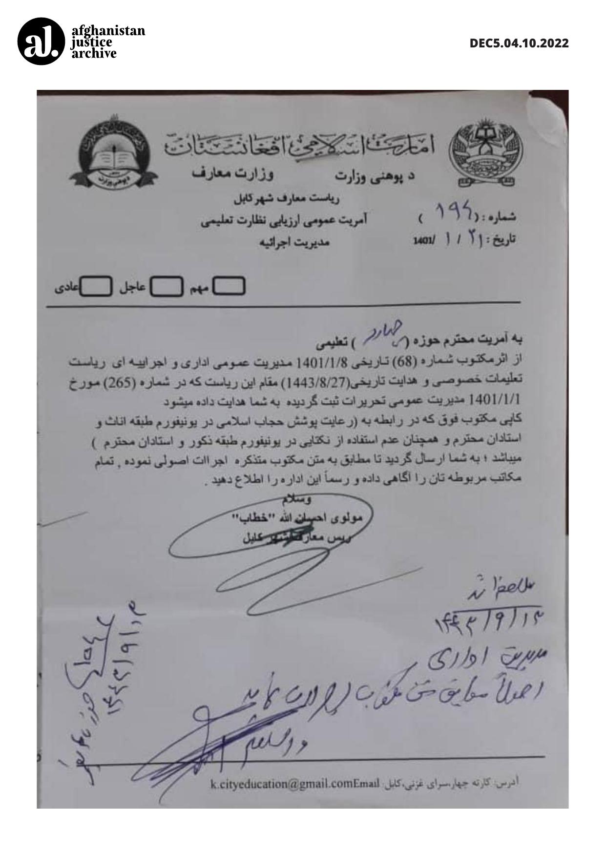 This directive institutionalizes the imposition of religious dress codes in schools, compelling both female and male students and teachers to comply with Taliban-defined "Islamic" standards. For girls and women, compulsory hijab represents a broader campaign of gender regulation; for boys and male teachers, banning neckties reflects ideological control over symbols perceived as "Western." These policies undermine personal autonomy and contribute to the politicization of the education system, where conformity to religious appearance is prioritized over academic freedom and inclusive learning environments.