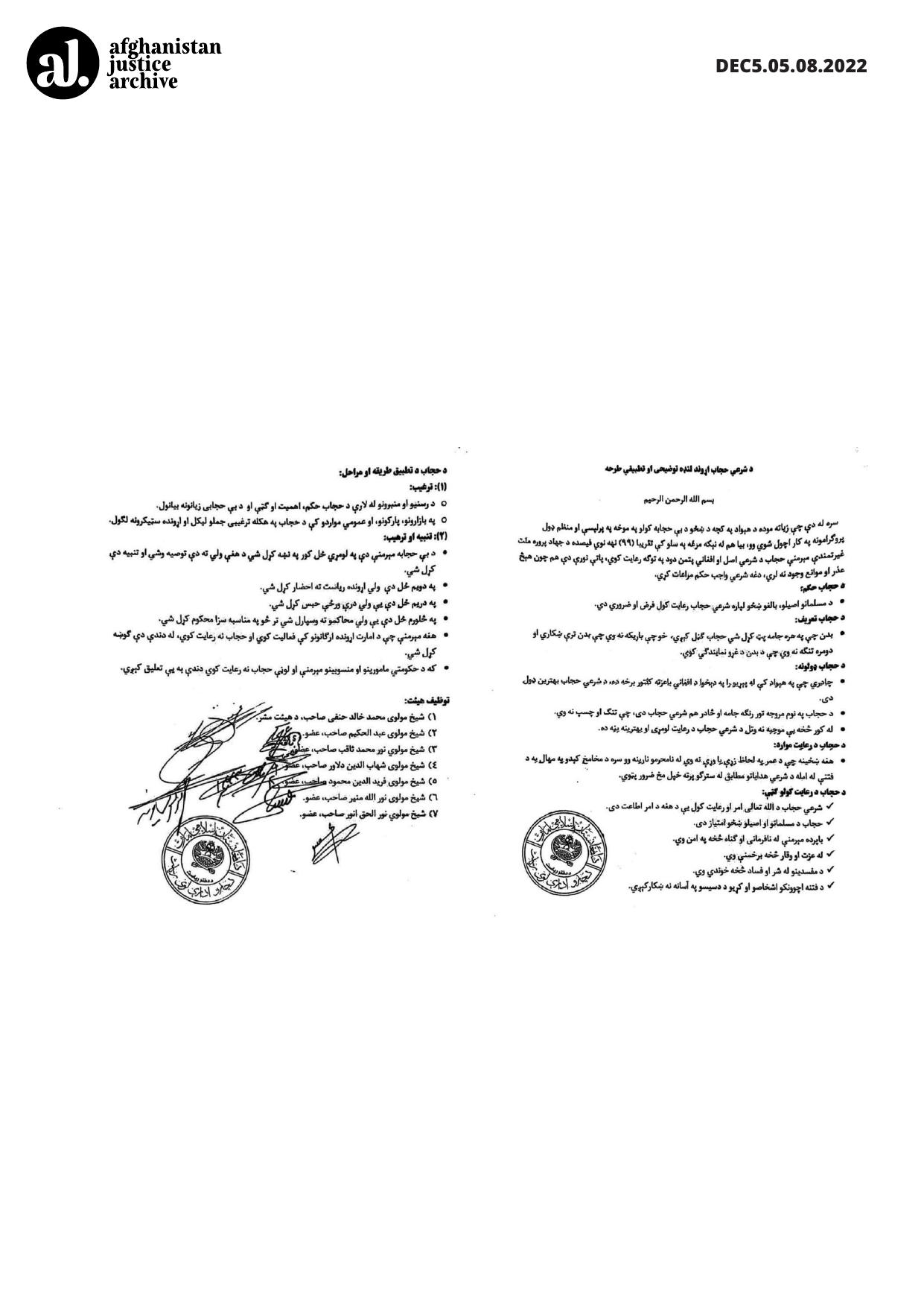The Taliban established a committee led by the Minister for the Promotion of Virtue and Prevention of Vice, along with six members of the Emirate cabinet, to develop a plan detailing the requirements of Sharia hijab, its enforcement process, and penalties for non-compliance. This plan was officially approved under Decree No. 1930 (dated 24/9/1443) by the Taliban leader and was published in the official government newspaper.