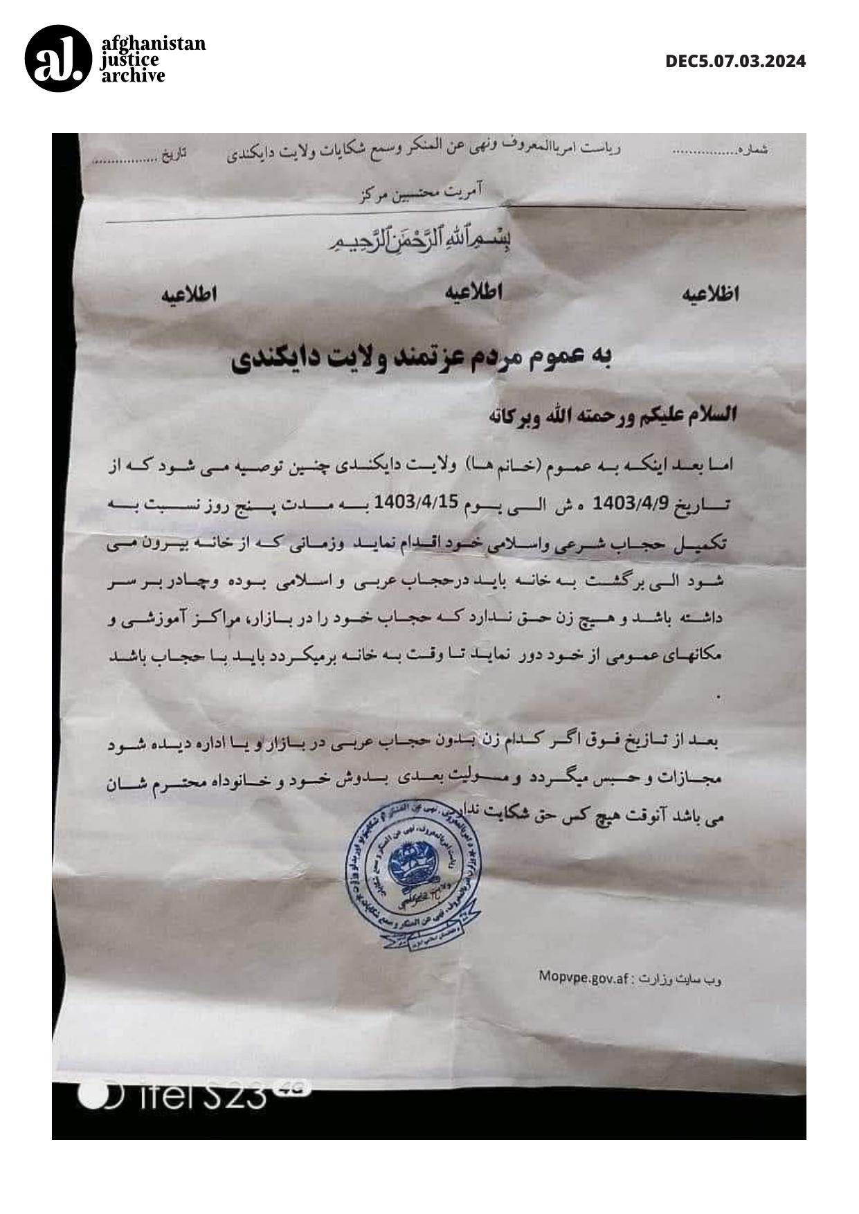 It is advised that all women in Daikundi province take necessary actions to ensure they fully observe the Islamic and Arabic hijab from the 29th of June 2024 to the 5th of July 2024, for a period of five days. During this time, women must wear the Arabic and Islamic hijab, including a head covering, whenever they leave their homes and must continue wearing it until they return home. No woman is allowed to remove her hijab in the market, educational centers, or public places, and she must remain covered until she returns home.