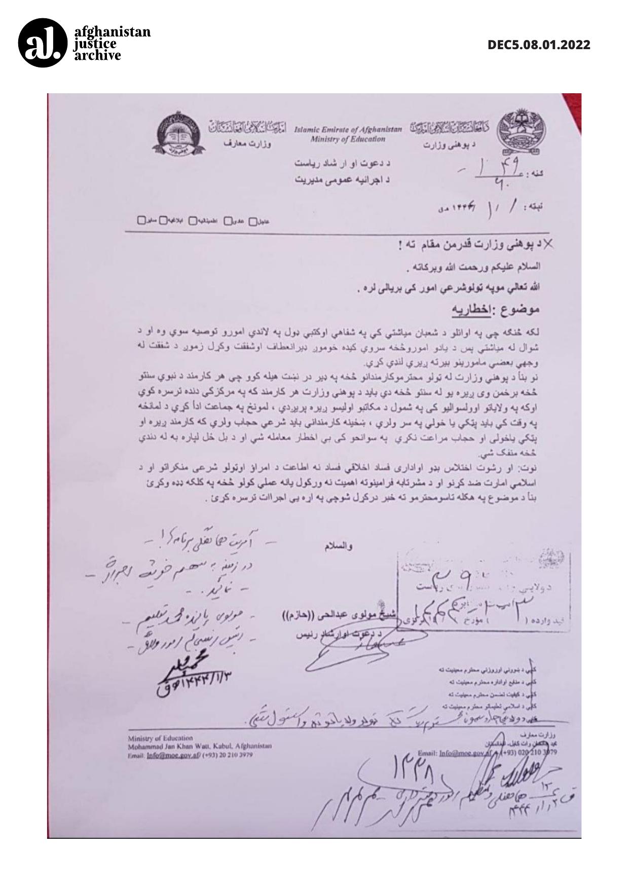This directive enforces ideological and religious conformity within the Ministry of Education, using disciplinary threats to mandate adherence to the Taliban’s interpretation. Ahmad Roan, the spokesperson for the Taliban Ministry of Education, did not confirm or deny the authenticity of this document and stated that he has "no information" about it. Recently, in Ghazni province, the Taliban detained five employees of the Ministry of Education for five hours because they had trimmed their beards. A source in Ghazni reported that the Taliban has formed a committee called the "Change of Belief," and this committee holds seminars for employees of the Ministry of Education in the province every week.