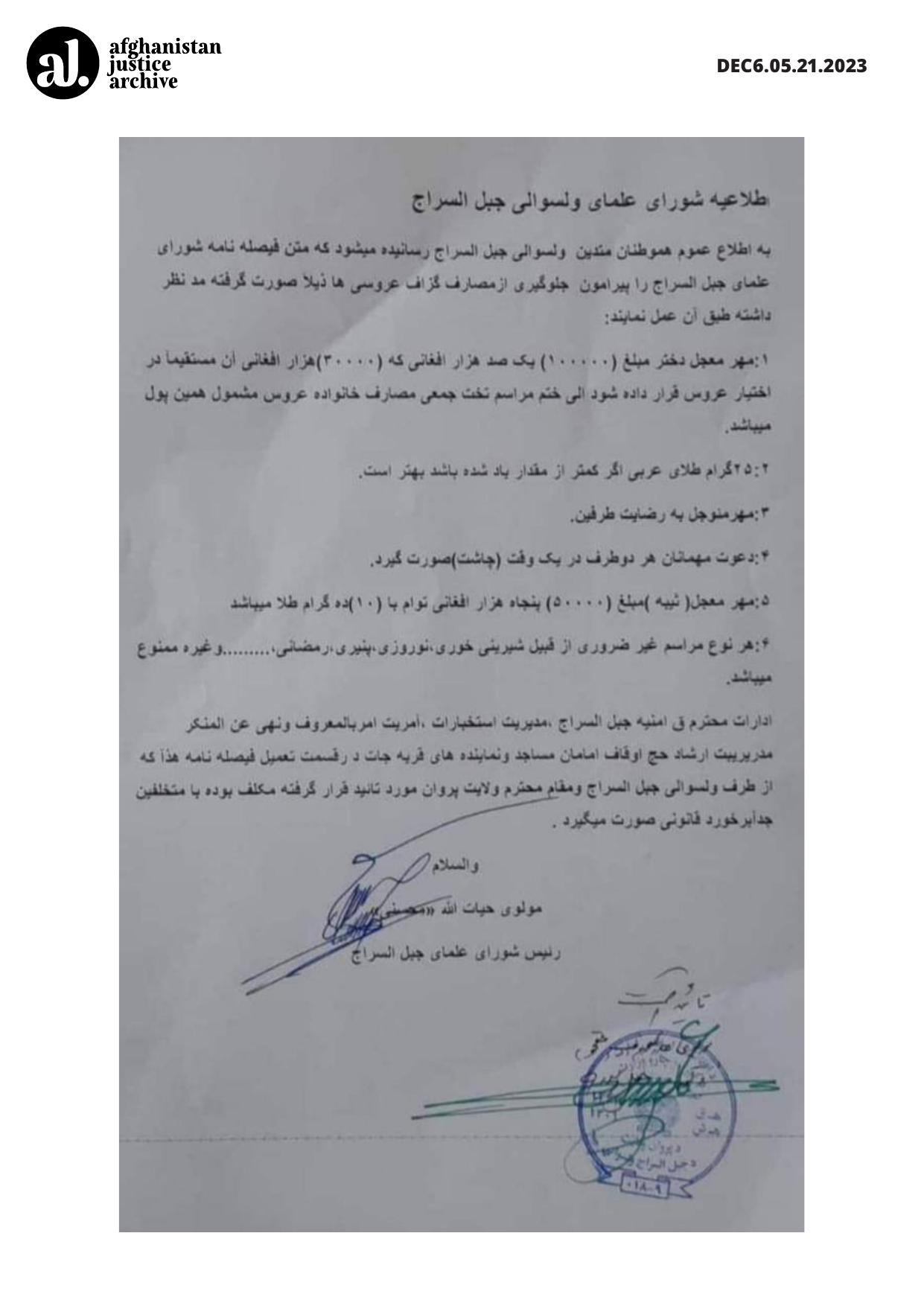 Respected institutions including Jabal al-Siraj Police Headquarters, Intelligence Directorate, Department of Promoting Virtue and Preventing Vice, Department of Guidance on Hajj and Endowments, mosque imams, and village representatives are obligated to enforce this decree approved by Jabal al-Siraj District Religious Scholars and the esteemed authorities of Parwan Province. Legal action will be taken separately against violators.