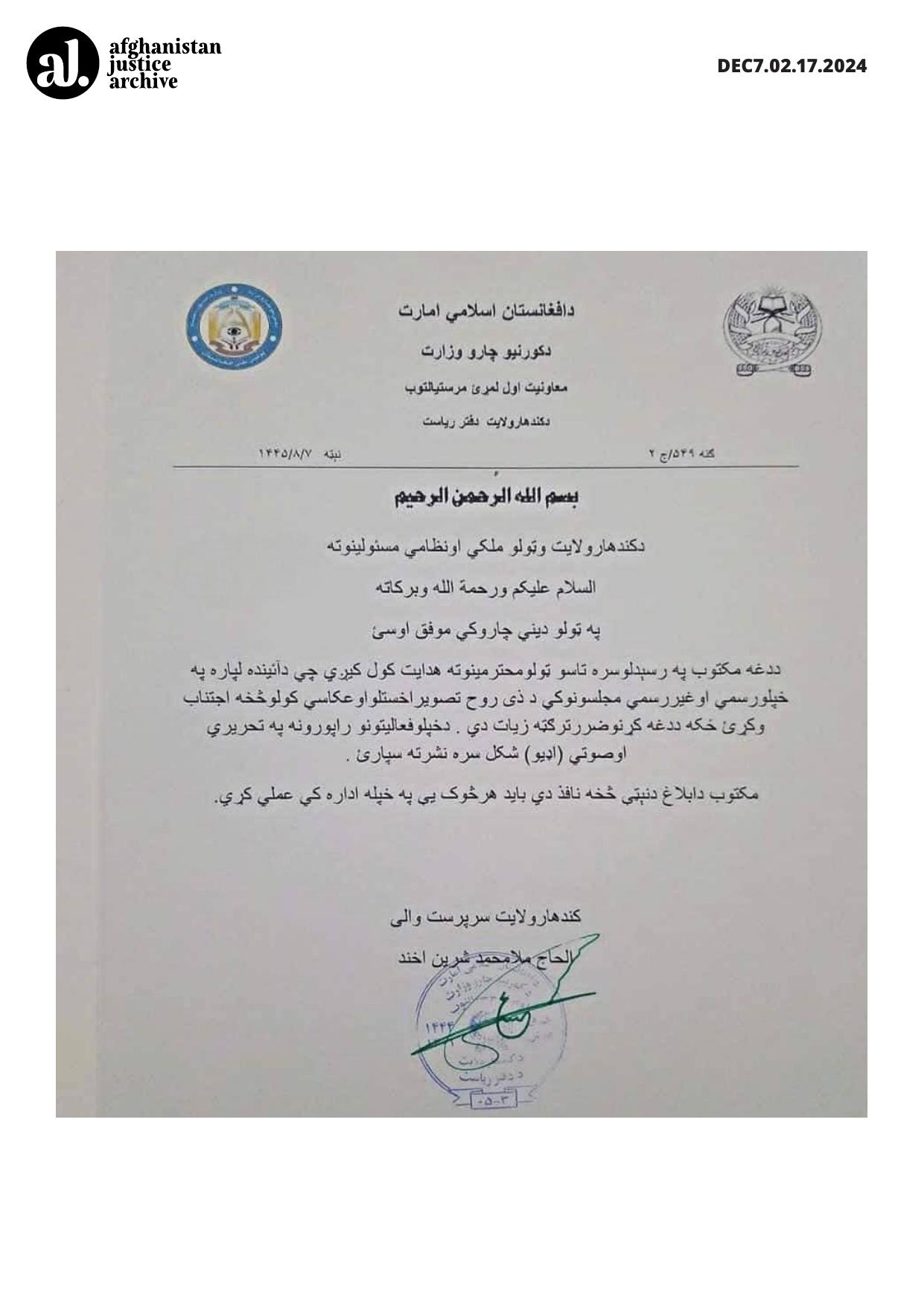 With the receipt of this letter, all respected officials are hereby instructed to avoid taking photographs or recording images of living beings in both official and unofficial gatherings in the future. The harm caused by such actions outweighs the benefits. Reports of your activities should be published in written or audio form.