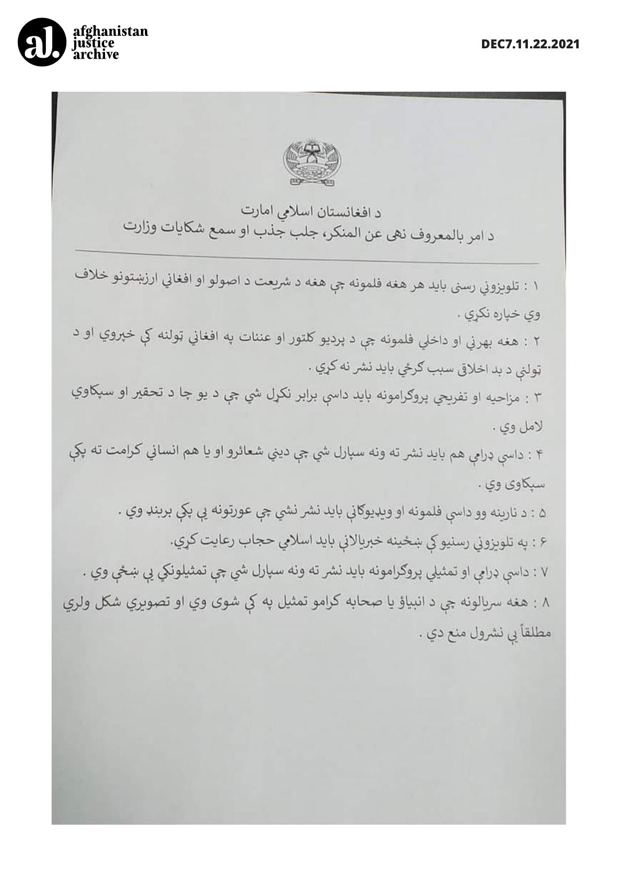 1. Television media should not broadcast any films that contradict the principles of Sharia and Afghan values