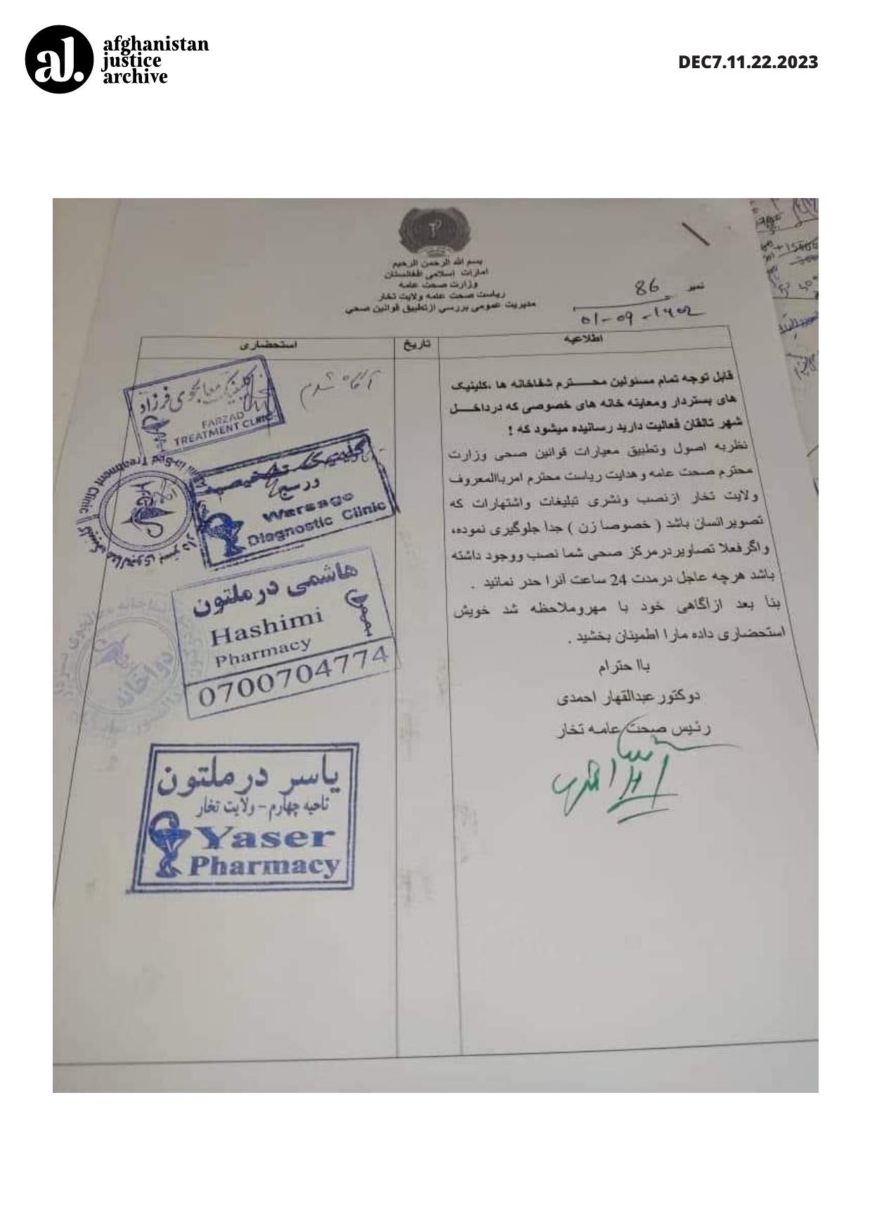 In accordance with the principles and application of the health laws and regulations of the Ministry of Public Health, and the directive from the Ministry's Vice and Virtue Directorate in Takhar province, the installation and display of advertisements containing human images (especially of women) is strictly prohibited. If any such images are currently displayed in your health center, they must be removed immediately within 24 hours.